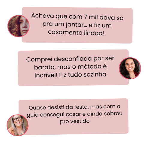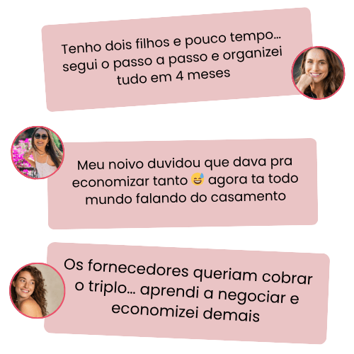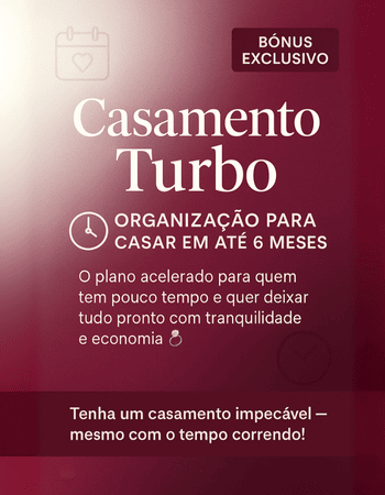 Tudo isso em um material fácil de entender e exemplos reais de noivas que conseguiram realizar o sonho do casamento perfeito gastando pouco.
